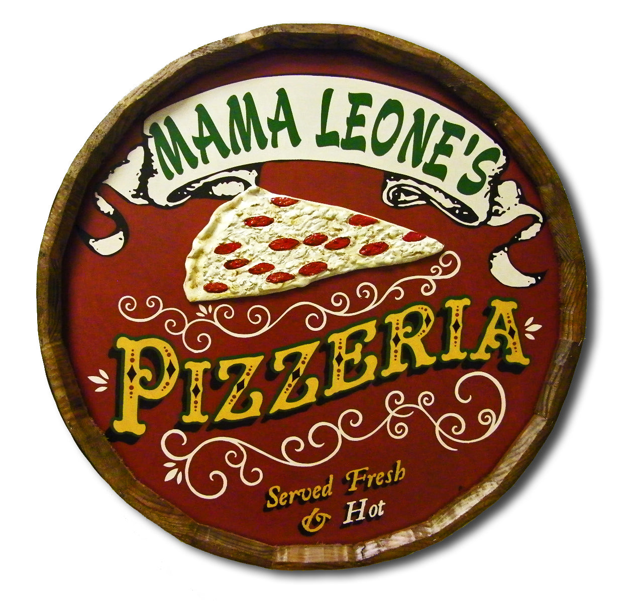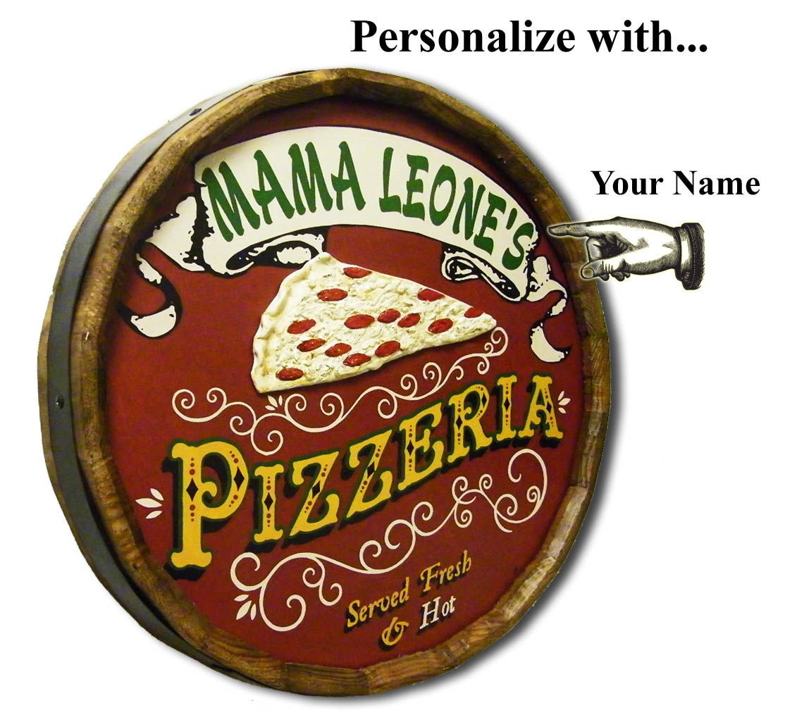 "Mama Leone's Pizzeria. Served Fresh & Hot." Personalized quarter barrel sign for pizza restaurant. Each is handcrafted in the USA. Customize with the name of your choice. Made in the USA.