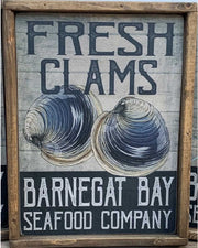 The epitome of coastal charm and culinary delight: our wood signs for the Barnegat Bay Seafood Company, proudly showcase the allure of seafood in a picturesque display. Each is a 24" x 18" framed wood sign exuding rustic elegance, evoking the nostalgia of seaside charm and the promise of delectable seafood treasures.
