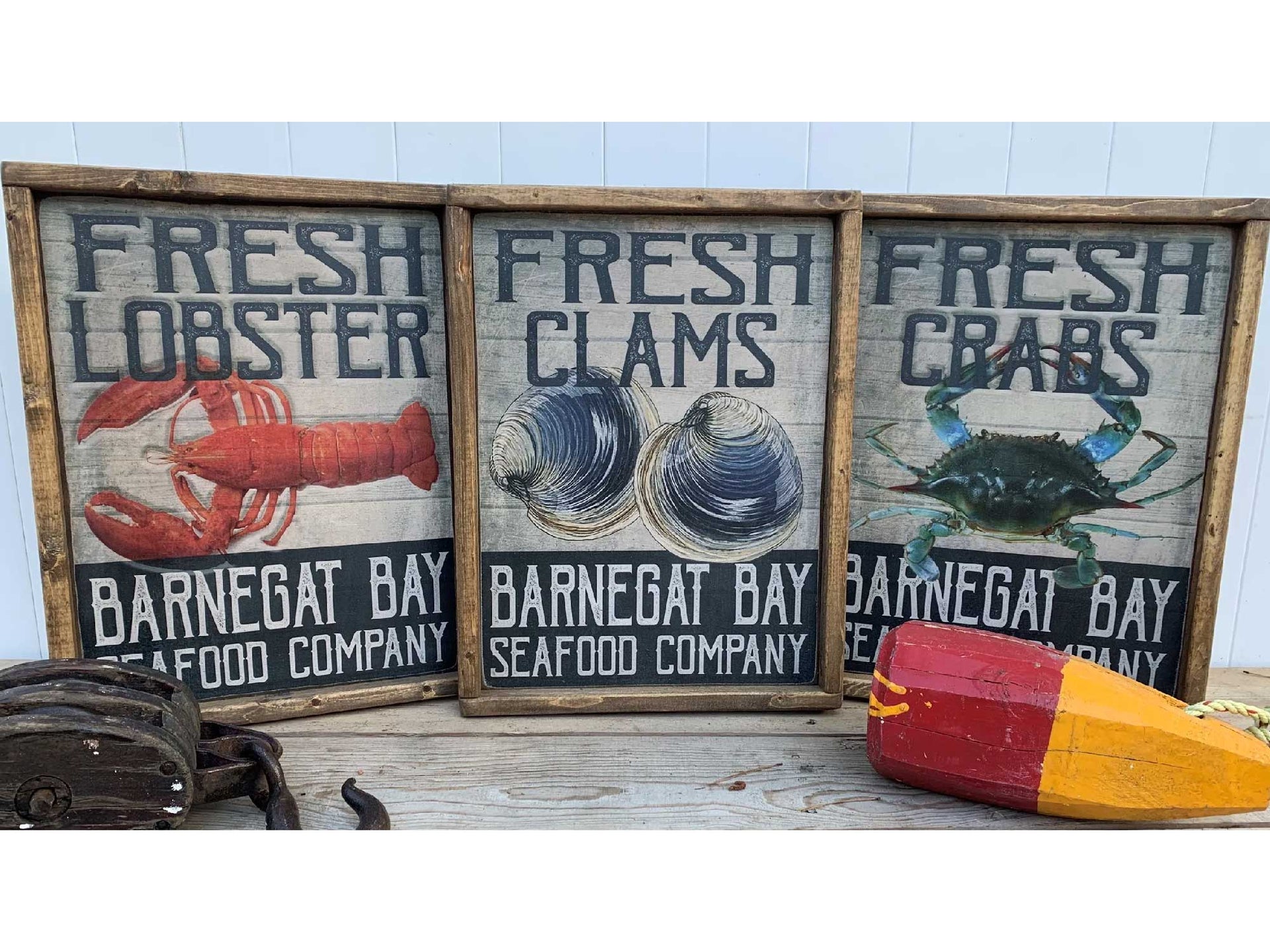 For those who crave a comprehensive coastal experience, our a set of three wood signs featuring equally enchanting depictions of lobster, clams and crabs. Together, these signs create an immersive tableau of maritime splendor, transporting admirers to the bustling docks of Barnegat Bay.