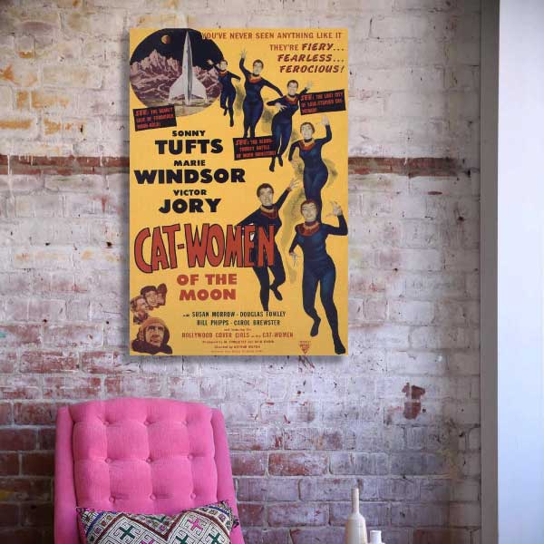 This stunning piece of art features the iconic poster for the 1953 science fiction film Cat-Women of the Moon. The art is printed on a sturdy wooden panel and is available in three sizes. It is ready to hang without framing and comes with two ¼ inch batons on the back to raise it off the wall.