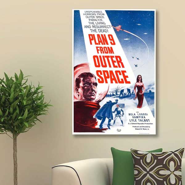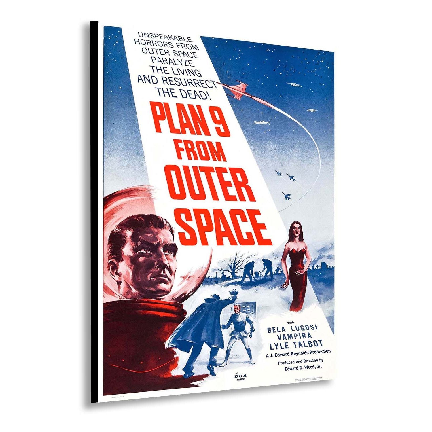 This stunning piece of art features the iconic poster for the 1950's science fiction film Plan 9 from Outer Space. The art is printed on a sturdy wooden panel and is available in three sizes. It is ready to hang without framing and comes with two ¼ inch batons on the back to raise it off the wall.
