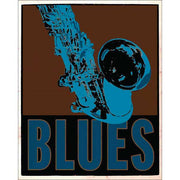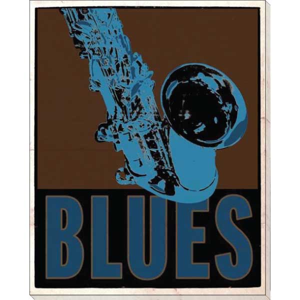 "BLUES" with saxophone. Wrapped canvas wall art print. Made in the USA.