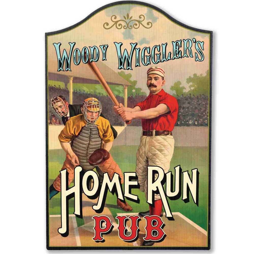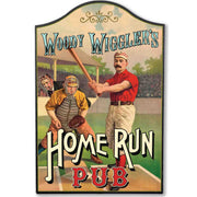 "Woody Wiggler's Home Run Pub." Vintage Wood Baseball Pub Signs. Crafted from wood and MDF, hand-painted and professionally printed using proprietary Poly-Arch Lithography. Each “sign art” piece is individually made-to-order. Hanging hardware or keyhole included for mounting.