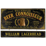 "Well Schooled. Beer Connoisseur. And All-Around Drinking Authority. From Ambers to Ales, My Taste Never Fails." Vintage wood sign with hand sculpted relief of a beer mug. Purchase with or without the personalized nameplate. The personalized nameplate and hardware is an additional $25 with two line of text (maximum 24 characters per line).