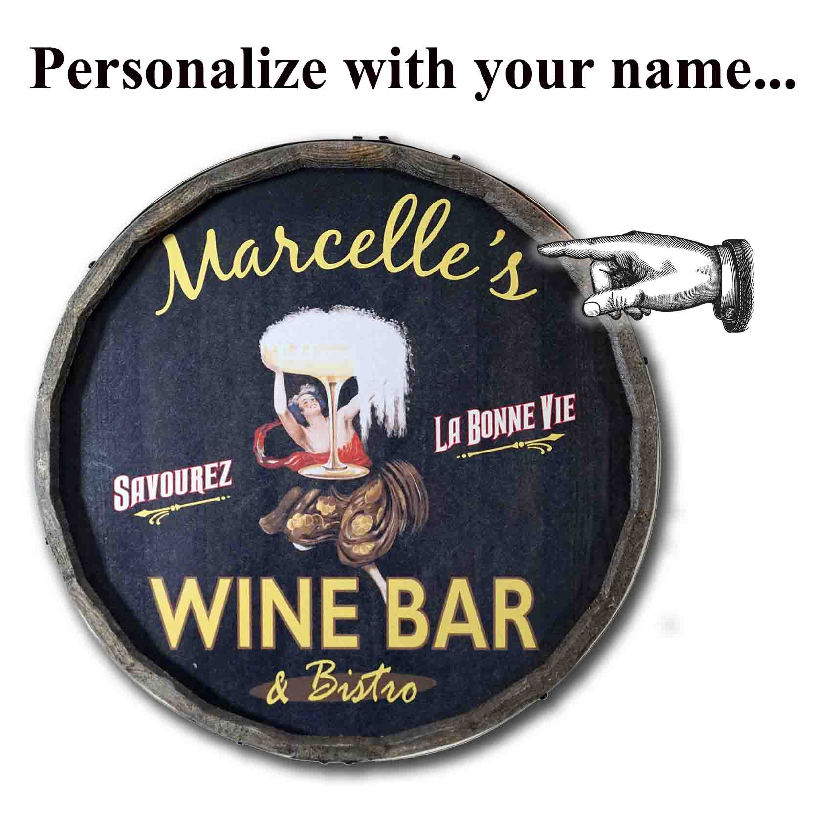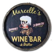 "Marcelle's Wine Bar & Bistro. Savourez. La Bonne Vie." Vintage personalized Quarter Barrel sign. Each is handcrafted in the USA. Personalized with the bistro name of your choice. Made in the USA.