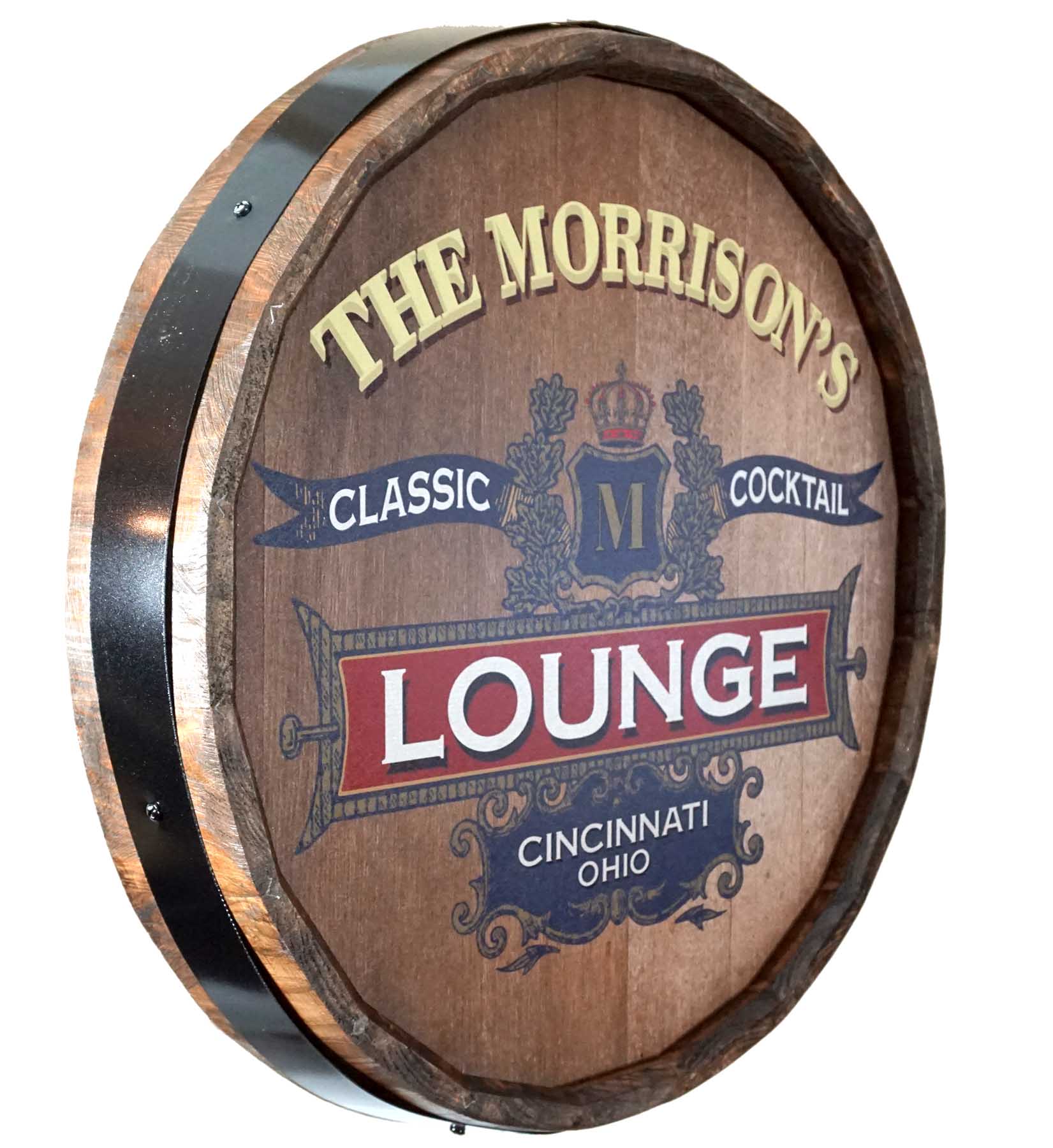 "The Morrison's. Classic Cocktail Lounge. Cincinnati. Ohio." Personalized Quarter Barrel sign. Each is handcrafted in the USA. Personalized with the name and location of your choice. Made in the USA.